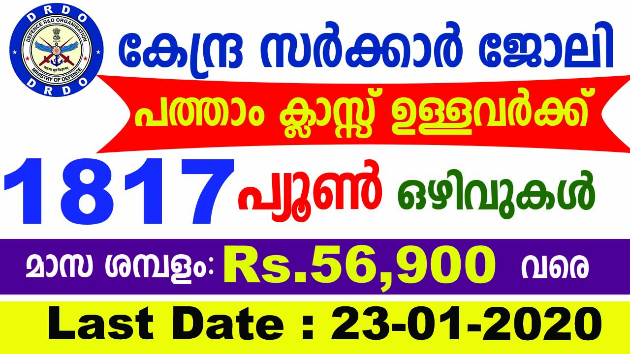 DRDO Recruitment 2020: Defence Research & Development Organisation (DRDO) & Centre for Personnel Talent Management (CEPTAM) is officially out the recruitment notification for 1817 candidates to fill their Multi-Tasking Staff (MTS) jobs in All over Central Govt.. The aspirants who are looking for the Kerala Govt jobs can utilize this wonderful opportunity. Also, the online application for the DRDO Latest Notification 2019 -2020 will start on 23rd December 2019. Interested aspirants should apply for the post before 23rd January 2020 for DRDO Recruitment 2020. Furthermore, to know more information about Multi-Tasking Staff (MTS) Careers, aspirants can refer below all the details. Therefore, All the eligibility criteria for the DRDO Recruitment 2020 are given below.