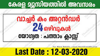Kerala Museum | Watcher cum Attendant | Total Vacancies: 24 | Last Date: 12th March 2020 | Apply Mode: Offline |Website: https://www.museumkeralam.org/