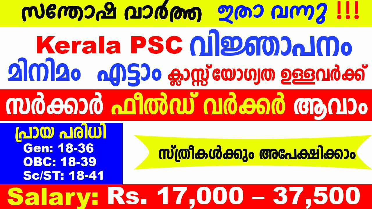 Kerala PSC Field Worker 2020 | Post Name: Field Worker ( Health Services)| Salary: Rs.17000-37500/- | Apply Mode: Online | Last Date: 05-02-2020