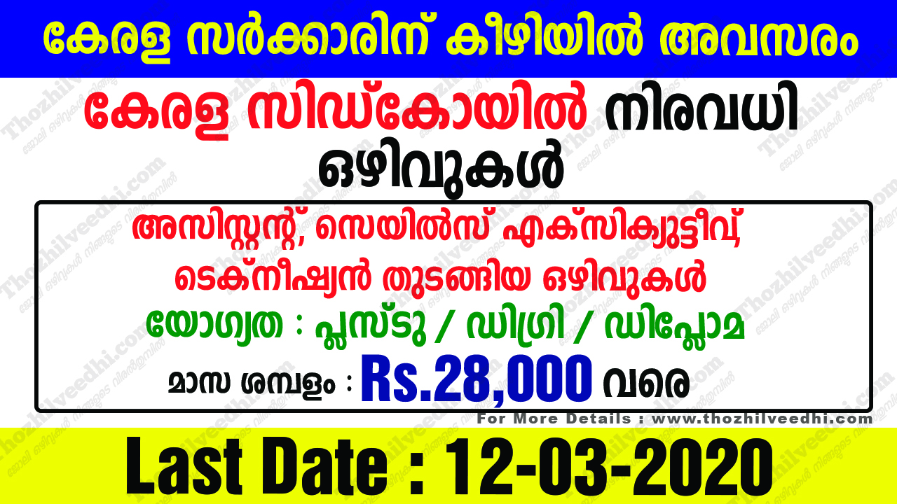 Kerala SIDCO Recruitment 2020: Kerala Small Industries Development Corporation Ltd (SIDCO) is officially out of the recruitment notification for 56 candidates to fill their Assistant, Sales Executive, Technician and Other jobs in All over Kerala. The aspirants who are looking for the Kerala Govt jobs can utilize this wonderful opportunity. Also, the Offline application for the Kerala SIDCO Latest Notification 2020 will start on 24th February 2020. Interested aspirants should apply for the post before 12th March 2020 for Kerala SIDCO Recruitment 2020. Furthermore, to know more information about Assistant, Sales Executive, Technician, and Other Careers, aspirants can refer below all the details. Therefore, All the eligibility criteria for the Kerala SIDCO Recruitment 2020 are given below.