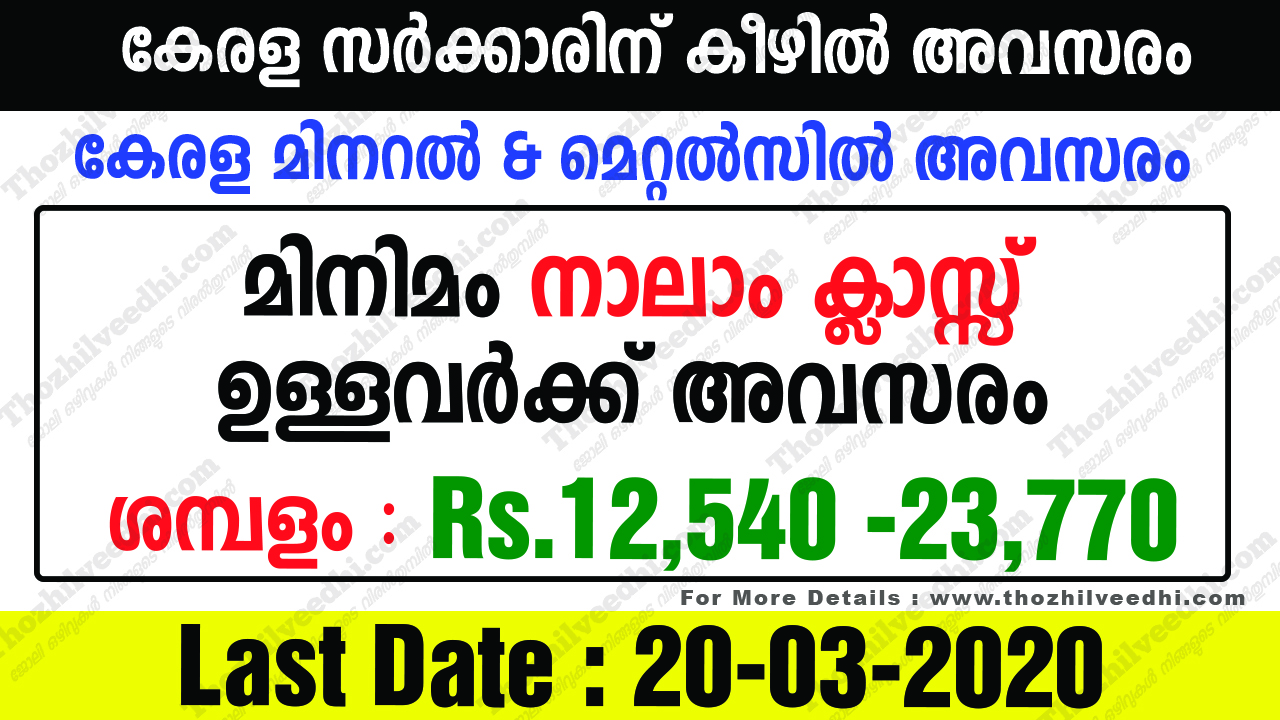 - Interested and eligible candidates may send the application to ‘Head of Department (P&A Legal), The Kerala Minerals & Metals Ltd, P.B No-4 Sankara Mangalam, Chavara, Kollam – 691 583′ so as to reach on or before 20/03/2020 by POST ONLY. Applications/ testimonials received after the closing date will not be entertained under any circumstances.